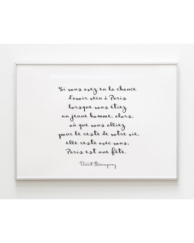 A Poster "Paris Is A Moveable Feast" with a quote by Ernest Hemingway. The typeface by Serbian graphic designer Lazar Dimitrijević's looks exactly like Hemingway's original handwriting. All glyphs are taken from Hemingway's letters and postcards, written by himself, and then reconstructed and adapted for typographic use.