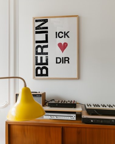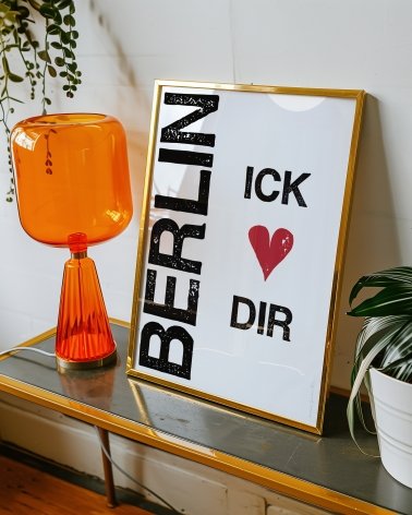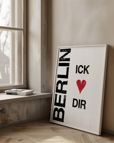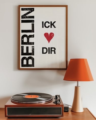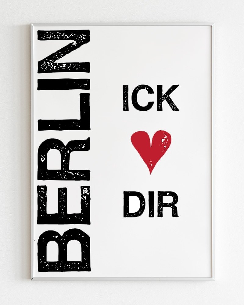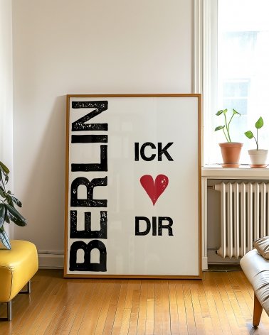 Póster de Berlín „Berlin Ick Liebe Dir“ ("Berlín te amo"). Este póster es una declaración de auténtico amor por Berlín, escrita en el dialecto berlinés Berliner Schnauze, un dialecto local tosco pero cálido, también conocido en alemán como "Schnauze mit Herz" (Schnauze con corazón).