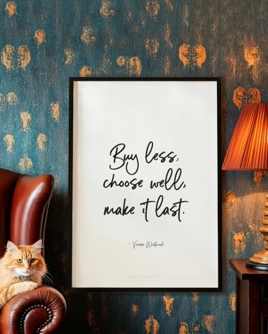 Affiche minimaliste imprimable "Buy Less, Choose Well, Make It Last" avec une citation d'une éminente créatrice de mode anglaise Vivienne Westwood. Cette police manuscrite à la mode accrocheuse par un graphiste anglais Sam Parrett incitera à acheter moins de mode et de décoration, à bien la choisir et à la faire durer.